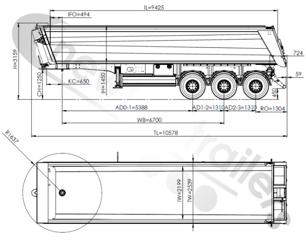 Full Aluminium tipping body. Sidewalls 4 mm (High quality alloy 5086 H24 ). Assembled with both unique patented extruded alloy profiles for weight saving and strength and also with pressed panels. The top rail profiles are 170 mm wide and form a rectangular frame (patented design) whilst generating a TRAPEZOID floor. This means the trailer body is becoming wider and larger to the rear door - massively assisting the discharge of the load and greater tipping safety.